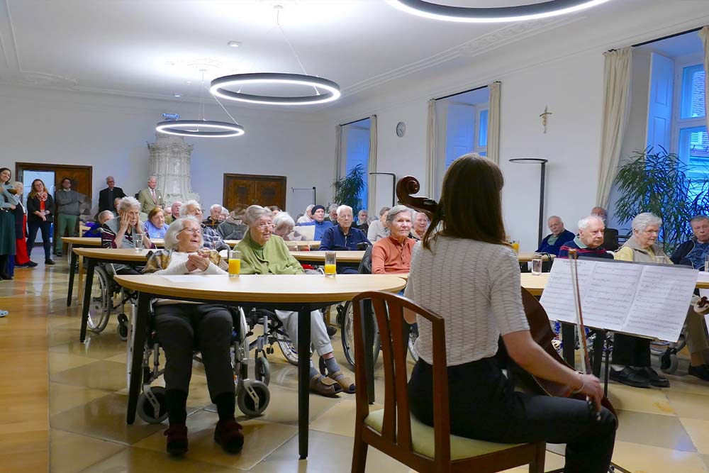 Auch im Jahr 2026 kann das Pflegewohnhaus des Malteserordens, das Malteser Ordenshaus, den Bewohnerinnen und Bewohnern monatlich eine besondere Bereichung der Lebensqualität bieten. Durch die dankenswerte Zusammenarbeit mit „Live Music Now“ kann auch 2026 jedes Monat ein besonderes Konzert junger Künstlerinnen und Künstler ermöglicht werden. Unser Dank gilt ganz besonders Gabriele Haffner von „Live Music Now“, wie auch Frau Suchy-Eissing, die die Konzerte regelmäßig begleitet und unterstützt. Ende Jänner 2026 fand das erste dieser monatlichen Konzerte im eleganten Refektorium des Malteser Ordenshauses statt. Zu Gast war ein Streichquartett, das eine bunte Auswahl großartiger Musikstücke präsentierte. Die Bewohnerinnen und Bewohner zeigten sich begeistert von bekannten österreichischen Melodien, wie z.B. „Wien, du Stadt meiner Träume“, oder „Wien bleibt Wien“. Die vertrauten Melodien schufen eine besonders warme und stimmungsvolle Atmosphäre die dazu motivierte, mitzuklatschen und mitzusingen. Ergänzt wurde das Programm mit großartigen Werken der klassischen Musik, wie dem „Intermezzo“ aus Mascagni’s „Cavalleria Rusticana“, „Habanera“ aus Bizet’s „Carmen“ und vielen weiteren Stücken. Diese wertvollen Momente der Freude und Verbundenheit fanden auch durch das Zusammenwirken des hochprofessionellen Teams des Malteser Ordenshauses mit den ehrenamtlich tätigen Mitgliedern des Malteser Hospitaldienstes Austria und des Malteserordens Ausdruck, die nach einer Besprechung in den Räumlichkeiten des Pflegewohnhauses die Gelegeneheit nutzten, eifrig mitzuhelfen, um die zahlreichen Gäste des Konzerts aus ihren Wohnungen im Haus abzuholen, während des Konzerts zu betreuen und sie anschließend wieder in ihr Zuhause zu bringen.